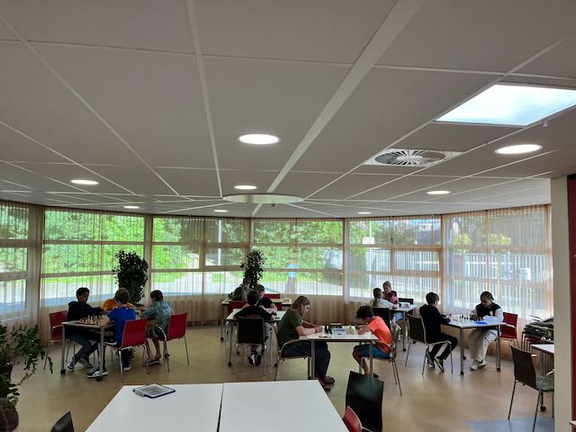 Zo staan we na 4 ronden op de 7e plaats (1e 12 gaan door), maar nu is wederom een favoriet de tegenstander, Michaël uit Leeuwarden in ronde 5. Rocco scoort knap een punt op bord 4, daar blijft bij: 1-3. Zoals vaker komt het nu op de laatste 2 ronden aan. Win je in ronde 6 én 7, dan ben je zeker van kwalificatie. In ronde 6 spelen we tegen Montessori uit Hilversum, wij staan 9e en zij staan 10e. De 4-0 overwinning is opvallend, het is een sterk team waar we tegen spelen. Rocco en Max halen 2 punten binnen op bord 3 en 4. Jonaël speelt op bord 1 een interessante partij tegen een sterke speelster en weet die uiteindelijk ook te winnen. Viggo speelt een uitstekende partij op bord 2. Meerdere malen werd er over en weer remise aangeboden, steeds werd er doorgespeeld en uiteindelijk wist Viggo een klein voordeel om te zetten in een mooie overwinning. Mooi om te zien hoe beide spelers na afloop elkaar bleven complimenteren over het vertoonde spel.