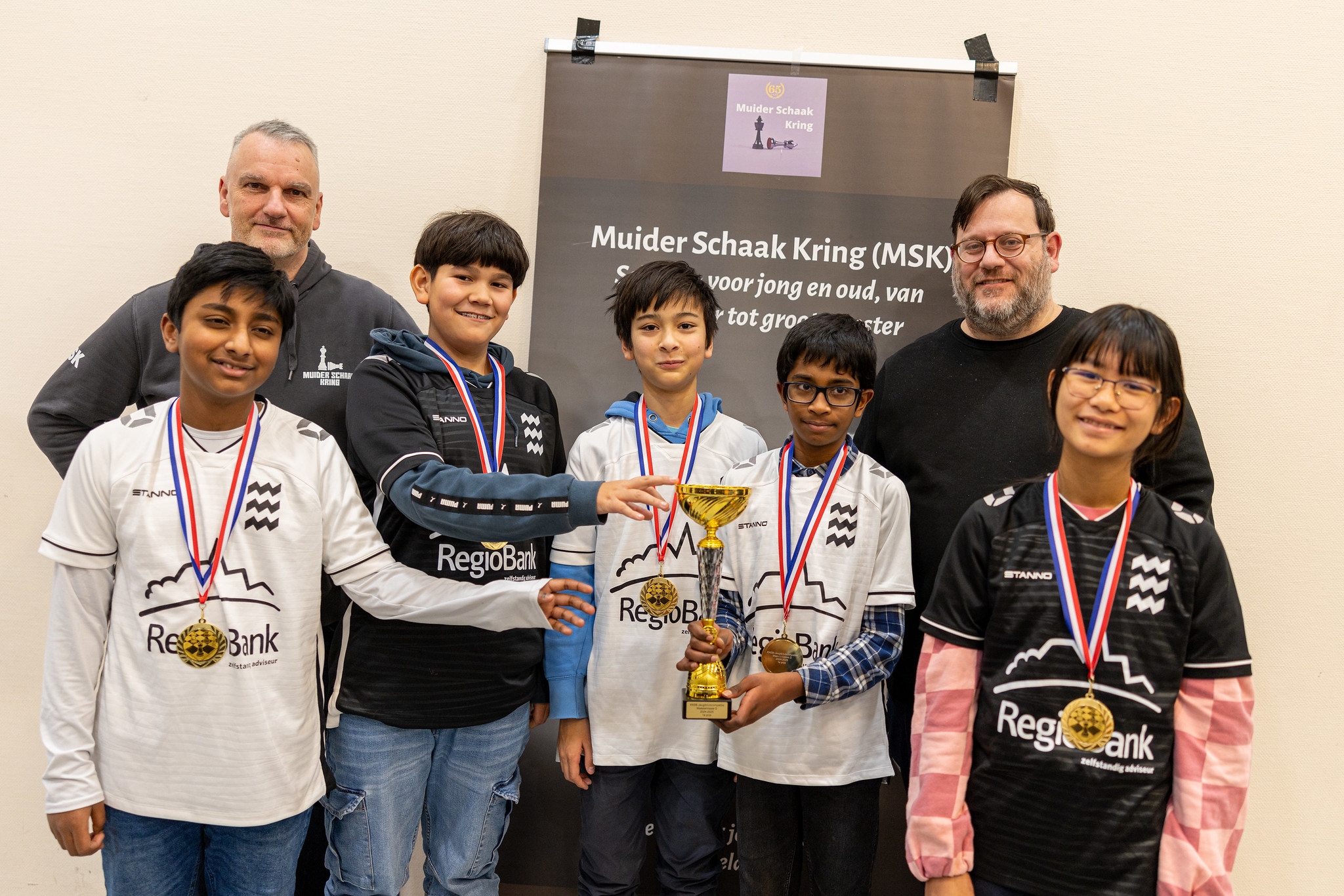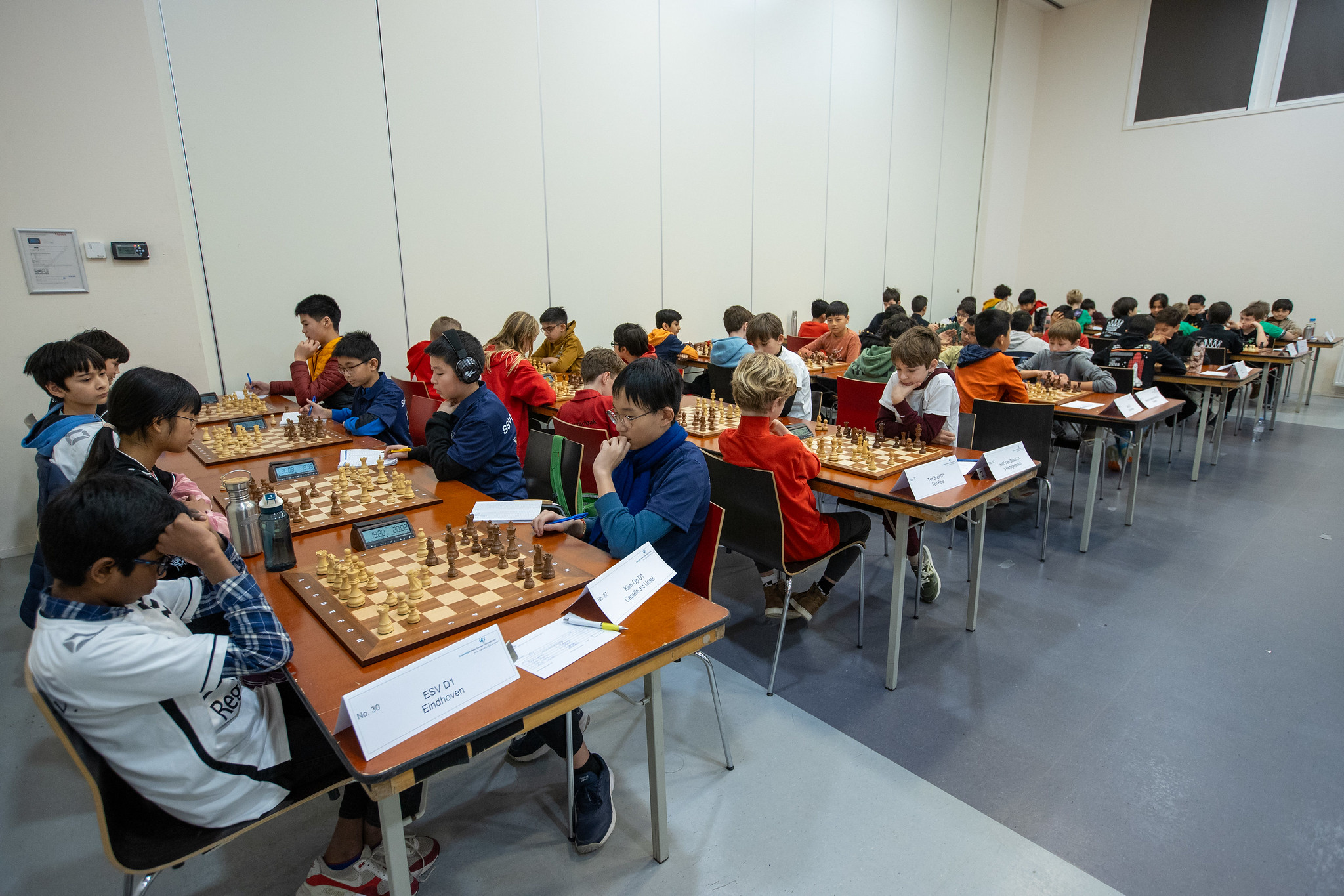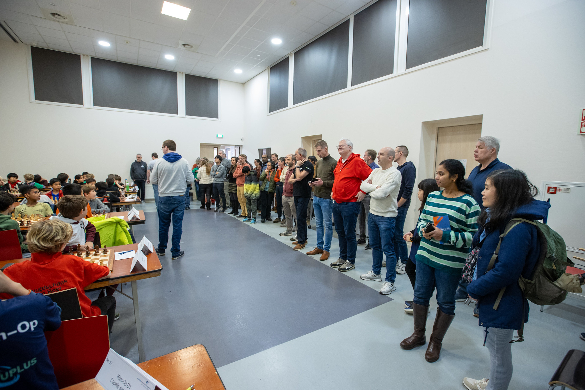 Op zaterdag 7 december was MSK gastheer van de landelijke finale van het NK voor D teams (tot 12 jaar). Onze eigen D1 was in de halve finale eervol uitgeschakeld. Twaalf teams uit heel Nederland speelden zes ronden Zwitsers. De SGA was met 3 teams vertegenwoordigd: VAS, Volewijckers en Almere. VAS werd uiteindelijk 5e, Almere werd 7e op bordpunten en Volewijckers eindigde als 11e. De Noordelijke bonden (FSB & NOSBO) hadden 3 teams: Ten Boer (met Bram ten Dam – 2166), Philidor uit Leeuwarden en Matadoren. Beide Groningse ploegen eindigden in het rechterrijtje: Ten Boer werd 10e, Matadoren eindigde 12e en laatste (maar heeft wel de mooiste clubnaam: Mat – ‘adore’). Philidor eindigde 4. Zuid-Holland was ook goed vertegenwoordigd en stabiel in de middenmoot: Op Eigen Wieken (3e), SHTV (6e) en Klim-Op (8e). Vanuit de SGS speelde Magnus Leidse Rijn mee en zij eindigden op een 9e plaats. Brabant kaapte plek 1 (ESV – Eindhoven) en 2 (HMC Den Bosch). Vanuit organisatorisch oogpunt: wederom een geslaagde toernooidag.