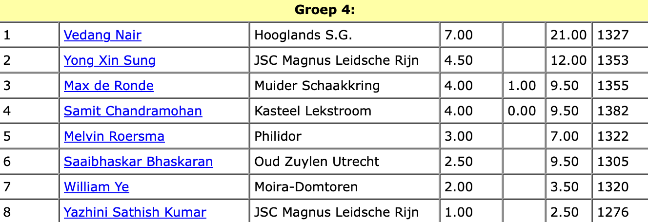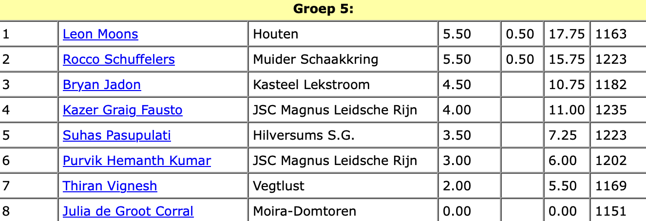 Rocco eindigde in groep 5 gedeeld 1e en werd op SB punten 2e. Hij begon met 0,5 uit 2 (o.a. remise tegen de latere winnaar) en won daarna 5x op rij. Zo werd wederom een beker binnengehaald.