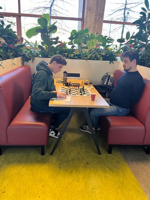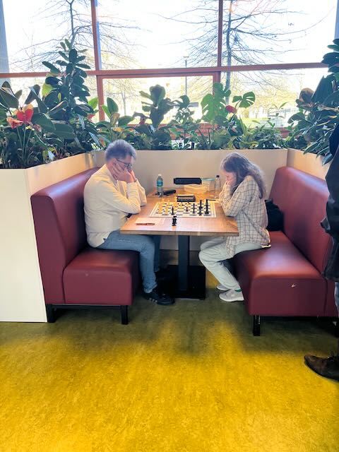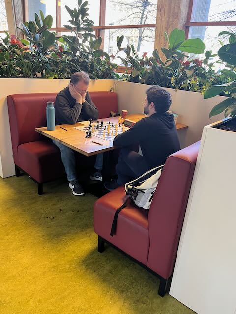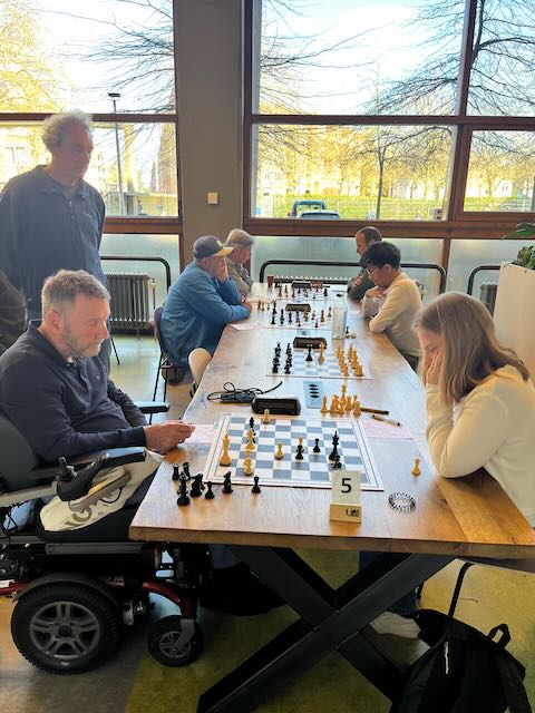 In de slotronde van het eerste seizoen in de KNSB speelde MSK 1 uit bij VAS. Ben is geruime tijd dubbellid geweest bij VAS, Lode is dat nog steeds. KNSB-thuiswedstrijden bij VAS zijn een schaakfestijn, waarbij de hele kantine van het Cygnus Gymnasium is gevuld met teams van VAS en hun tegenstanders. Zaterdag 5 april speelden er 7 teams van VAS thuis, met o.a. de hoofdstedelijke derby in klasse 1A tussen VAS 1 en Caïssa 1. Een paar tafels verderop namen we op gepaste wijze afscheid van de 5e klasse. Frank (4) kwam als eerste op het scorebord, door een remise te scoren tegen VAS-voorzitter Remy Hakvoort. Lode (8) volgde met een solide remise tegen zijn oud-ploeggenoot Jaap Goudriaan. Helaas volgden daarna twee nederlagen: Olivier (3) en Marc (2) konden het niet bolwerken tegen 1900+-spelers. Henk (7) leek een remise te kunnen houden, maar werd vakkundig verslagen in het eindspel. Dolf (5) won knap van teamleider Benno. Ben (1) versloeg toptalent Bregje door beter tijdmanagement en beter positiespel. Toen was de score 4-3 voor VAS. We hebben tot nu toe alles verloren in ons debuutseizoen. Gloort hier het eerste wedstrijdpunt? Ibrahim (6) staat achter, weert zich kranig, dreigt in een verloren eindspel toch nog de partij te kantelen door een toren achter de witte pionnen te krijgen, maar tevergeefs: hij verliest en met 5-3 verlaten we de 5e klasse, puntloos.