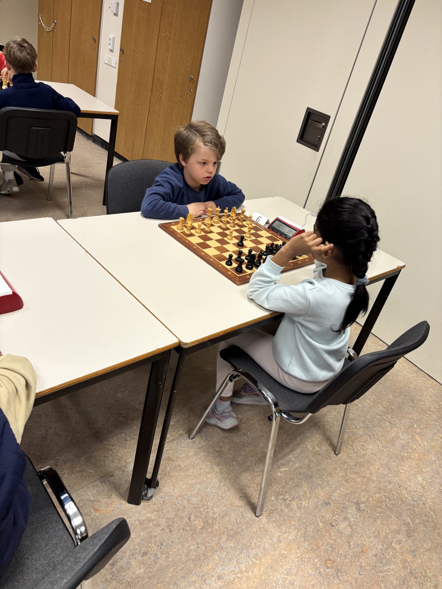 Drie MSK’ers speelden mee bij de SGA Pupillendag, georganiseerd door Amsterdam West. Toernooi is bestemd voor de F-, G- en H-jeugd: de jongste leden van de clubs. Het is opvallend hoeveel deelnemers er waren (56) en hoe goed er op sommige borden werd geschaakt. In de G-groep speelde Guus met veel plezier en scoorde hij behoorlijk: 3 punten uit 7 wedstrijden. In de F-groep kwam Emma dichtbij kwalificatie voor het NK voor meisjes: 1 overwinning extra had haar een barrage opgeleverd voor de resterende plek, nu waren 3 punten net niet genoeg. Mees Pieterse speelde zijn eerste echte grote serieuze toernooi (hij miste eerder het schoolschaaktoernooi), deed heel erg zijn best, bleef vrolijk en kwam steeds beter in zijn spel. Helaas kwam dat niet in de punten tot uitdrukking, maar een volgende keer gaat het zeker beter. Nog 1 opvallende deelname: bij de H-groep werd Sam Korff de Gidts (van Amsterdam West) 2e: neefje van ons lid Tom Korff de Gidts.
