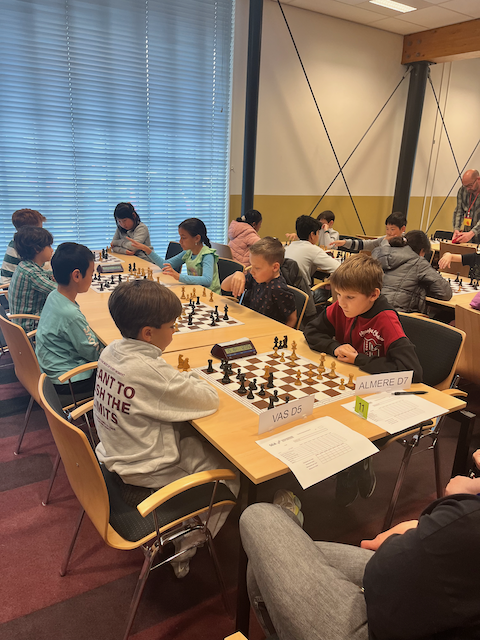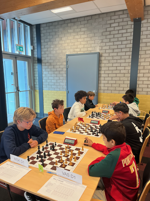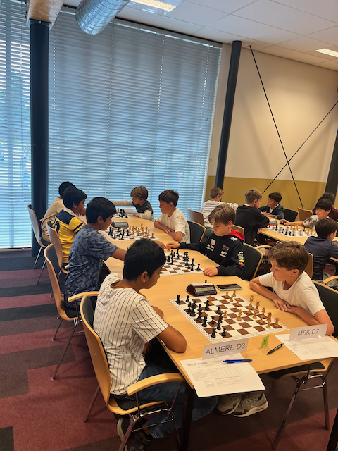 De D1 was in de sterkste opstelling aanwezig: Jonaël, Leandro, Elisa en Max. Qua rating een 5e plaats vooraf, achter VAS D1 en D2, Zukertort D1 en Almere D1. Volewijckers D1 en Zukertort D2 zijn andere ploegen die wellicht ook kans maken op de top-4. In de 1e ronde tegen MSK D2 werd 3-1 gewonnen, maar stal Luuk van MSK D2 de show met een fraaie vork die uiteindelijk de winst voor hem betekende. Maakte dat op het einde het verschil? Nee. Win je met 4-0, dan speel je tegen andere tegenstanders in de daaropvolgende rondes. In ronde 2 werd een belangrijke overwinning op Volewijckers geboekt: 3,5 – 0,5. Tegen de favorieten VAS D1 (0-4) en Zukertort D1 (1-3) werd verloren. Een bordpunt meer, her en der, was wel mogelijk geweest.