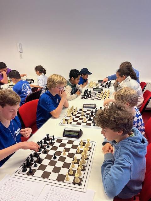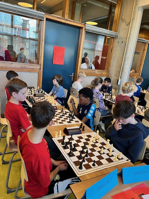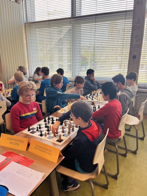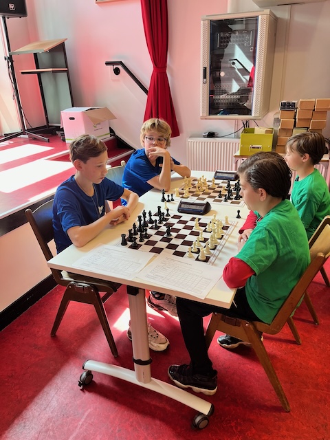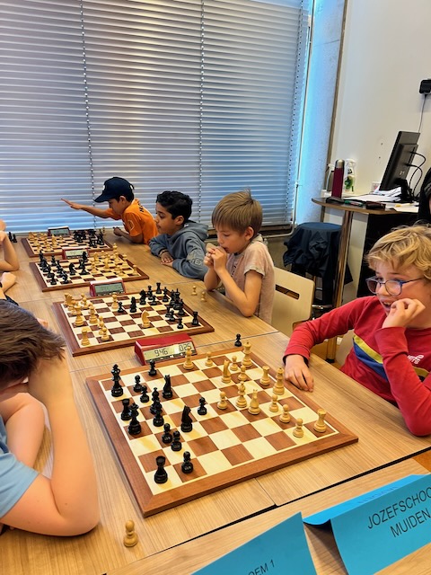 In de 1e ronde werd Kastanjelaan uit Leiderdorp soepel met 3,5 – 0,5 verslagen. Op bord 1 speelde Jonaël remise, de rest won. In de 2e ronde stond 1 van de favorieten op het programma, GSV 1 uit Groningen. Een team met een gemiddelde rating van 1833, waar de 9-jarige speler op bord 1 een rating heeft van 1957. Een 4-0 nederlaag is logisch. Om kansen op kwalificatie te houden, is het dan wel zaak om de volgende ronden punten te blijven pakken. In ronde 3 wordt Jenaplan Wittevrouwen uit Utrecht met 3-1 verslagen, al zag het daar in het begin niet naar uit en leek een 2-2 score of een nederlaag waarschijnlijk. In ronde 4 troffen we onze buren van de Flierefluiter uit Almere. Yuxien op bord 1 is een bekende van diverse jeugdtoernooien, Elisa op bord 2 is MSK-er en Nael op bord 4 is ook bekend van jeugdtoernooien. Bovendien is het een school waar Jarno les geeft. Op bord 4 staat Mo verloren (2 stukken achter) maar weet hij toch met een mat achter de paaltjes een onverwachte 1 te scoren. Op bord 1 is het een remisestelling totdat Yuxien te optimistisch richting de pionnen van Jonaël loopt en er toch een 1 voor de Jozefschool op het bord komt. Elisa verdedigt goed tegen Viggo maar die wint uiteindelijk toch. Max speelt een heel sterk toernooi en ook hij wint. De 4-0 overwinning is geflatteerd, maar uiteindelijk van groot belang. Op deze manier komen we ronde 3 en 4 goed door.